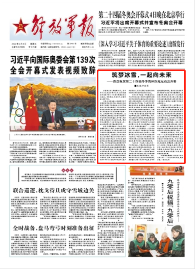 今夜,當(dāng)五星紅旗、五環(huán)旗再次在中國國家體育場冉冉升起,當(dāng)奧林匹克會歌在萬眾矚目中悠揚(yáng)奏響,當(dāng)北京冬奧會的火炬點(diǎn)亮古都夜空,中華文明同世界各國文明的交流互鑒將譜寫出新的華章,世界奧林匹克運(yùn)動將翻開嶄新一頁。全球聚焦中國,北京擁抱世界。這是新冠肺炎疫情發(fā)生以來首次如期舉辦的全球綜合性體育盛會,是中國人民的榮耀,也是奧林匹克運(yùn)動的光輝。解放軍和武警部隊(duì)廣大官兵同全國人民一道,熱烈祝賀北京冬奧會隆重開幕!