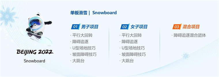 北京2022年冬奧會共設有男女U型場地技巧、坡面障礙技巧、平行大回轉、大跳臺和障礙追逐等項目,一共產生11枚金牌,其中障礙追逐混合團體比賽是北京冬奧會新增小項。