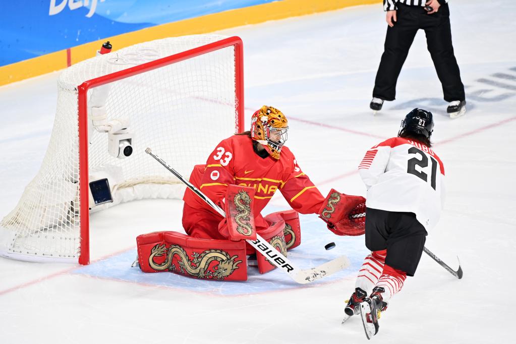 2月6日,中國(guó)隊(duì)守門(mén)員周嘉鷹(左)在北京2022年冬奧會(huì)女子冰球小組賽中成功封堵對(duì)方球員射門(mén)。新華社記者李然攝