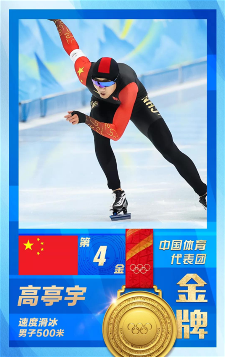 12日下午的“冰絲帶”再度見(jiàn)證了歷史!中國(guó)代表團(tuán)開(kāi)幕式旗手高亭宇亮相速度滑冰男子500米賽場(chǎng),以34秒32的驕人成績(jī),打破了由挪威選手在2018年平昌冬奧會(huì)上創(chuàng)造的34秒41的奧運(yùn)會(huì)紀(jì)錄,為中國(guó)代表團(tuán)拿下第四金。