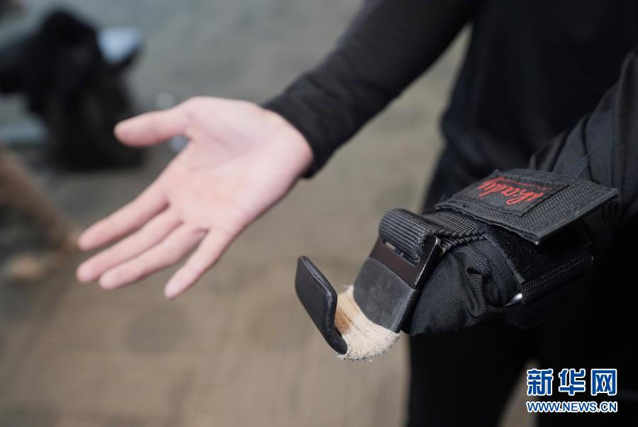 3月19日,冬殘奧會(huì)國(guó)家集訓(xùn)隊(duì)單板滑雪運(yùn)動(dòng)員紀(jì)立家在運(yùn)動(dòng)員駐地進(jìn)行體能訓(xùn)練時(shí)展示他穿戴的俗名“鉤子”的輔助器械。