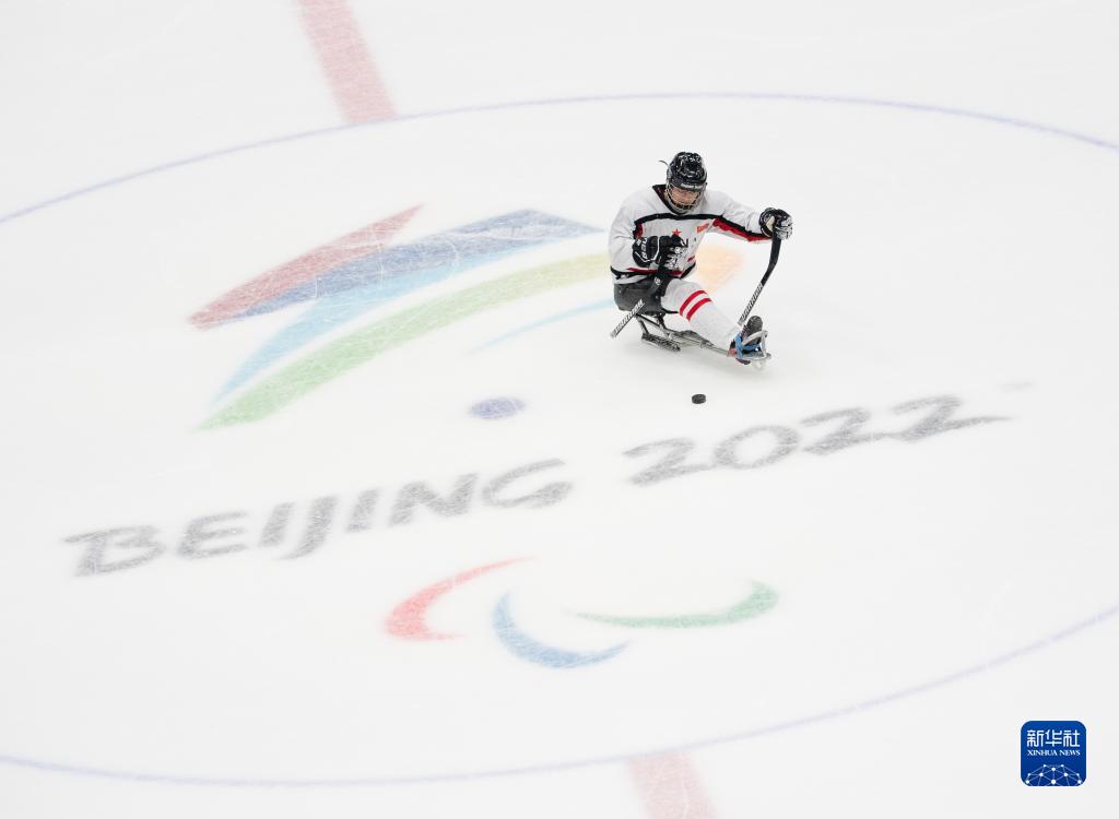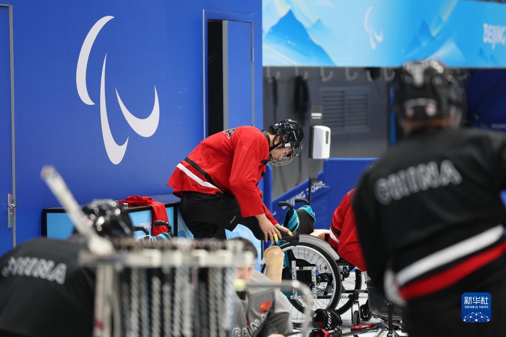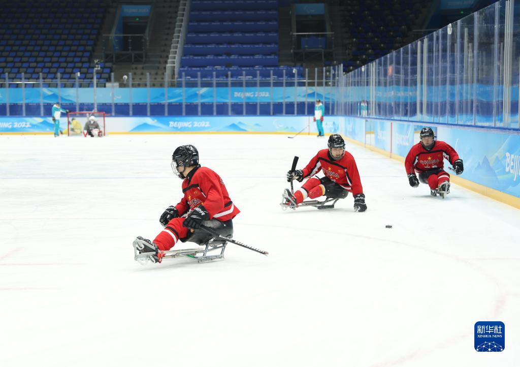 當(dāng)日,中國殘奧冰球隊在北京國家體育館進(jìn)行賽前訓(xùn)練,備戰(zhàn)北京2022年冬殘奧會比賽。