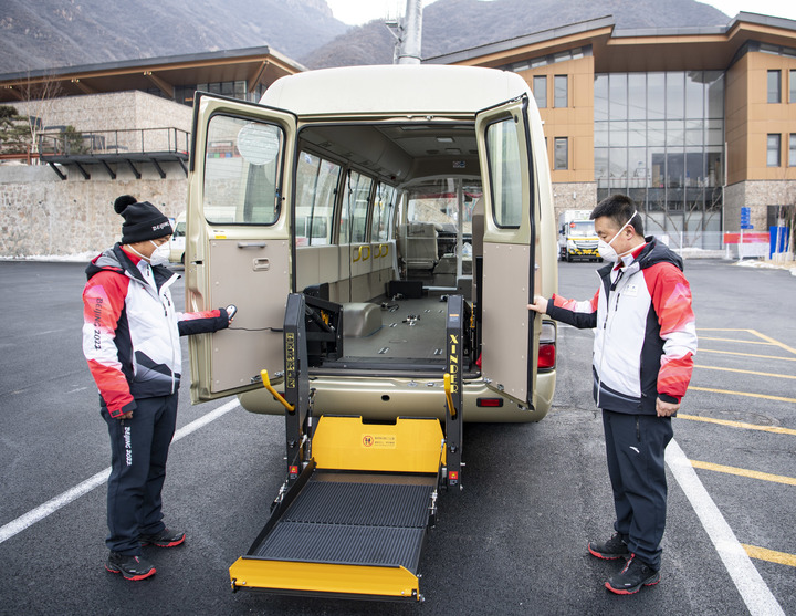2月28日,工作人員在國家高山滑雪中心展示場館內(nèi)的無障礙車輛。新華社記者 孫非 攝