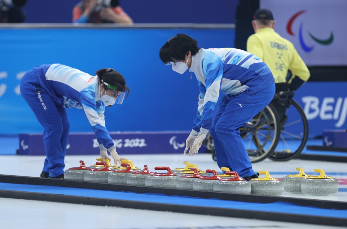 3月6日,志愿者在輪椅冰壺循環(huán)賽中為運(yùn)動(dòng)員整理冰壺,手套上記錄著冰壺?cái)[放順序。新華社記者 許雅楠 攝