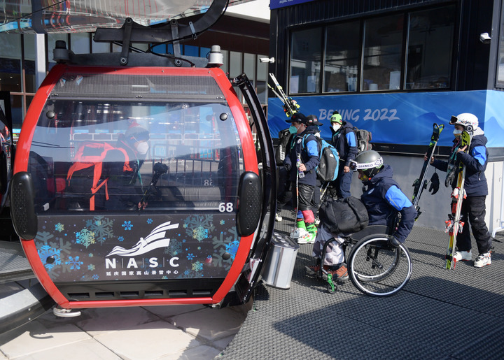 2月28日,運(yùn)動(dòng)員在國(guó)家高山滑雪中心乘坐纜車(chē)。新華社記者張晨霖?cái)z