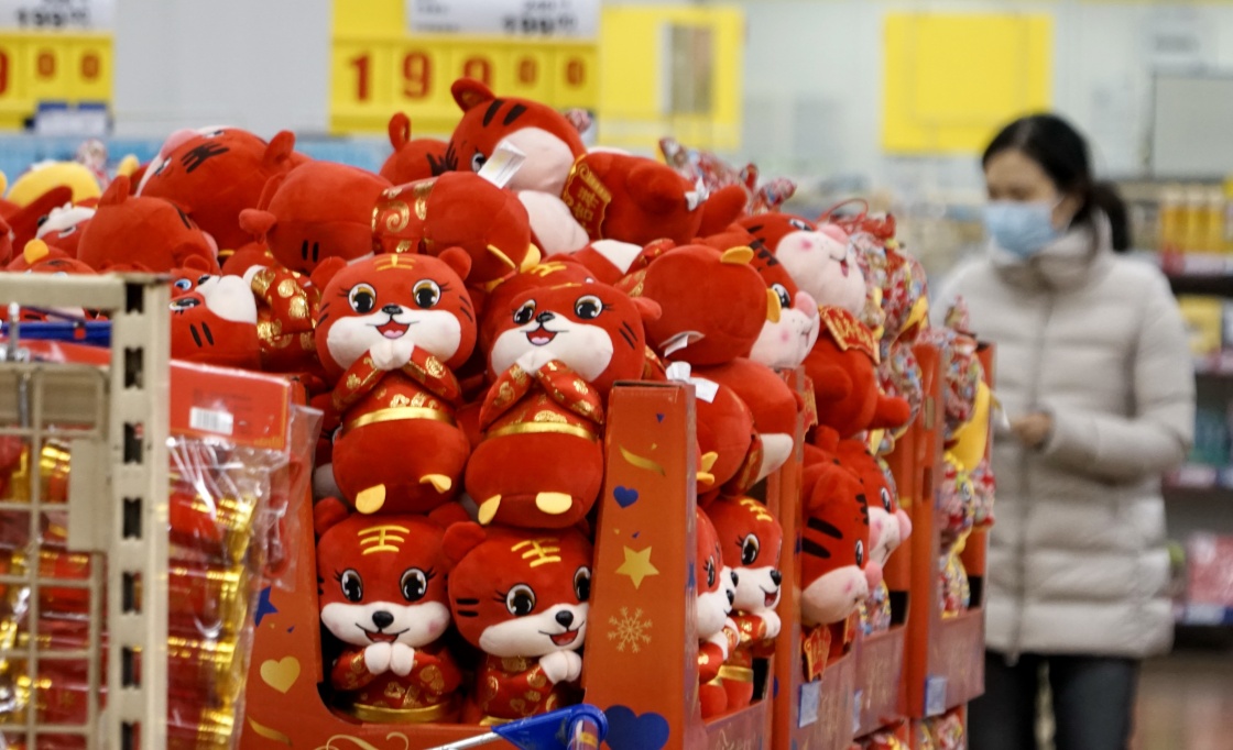 1月5日拍攝的北京市海淀區(qū)一家超市內(nèi)銷售的虎年吉祥物玩具。新華社記者李欣攝