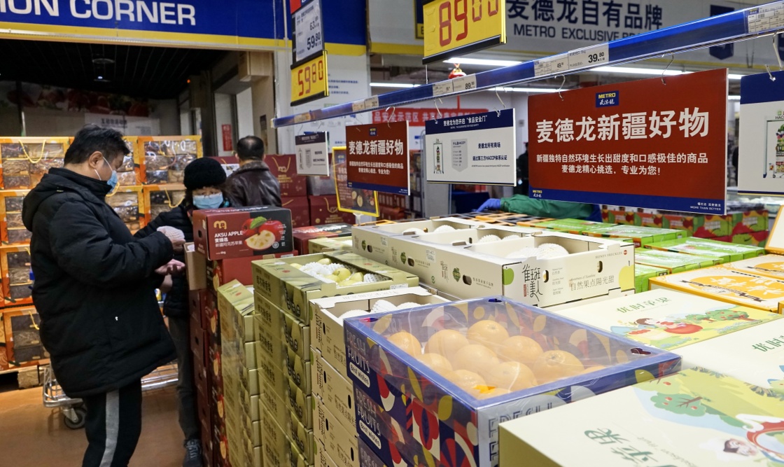 1月5日,市民在北京市海淀區(qū)一家超市的新疆優(yōu)質(zhì)水果專柜選購水果。新華社記者李欣攝