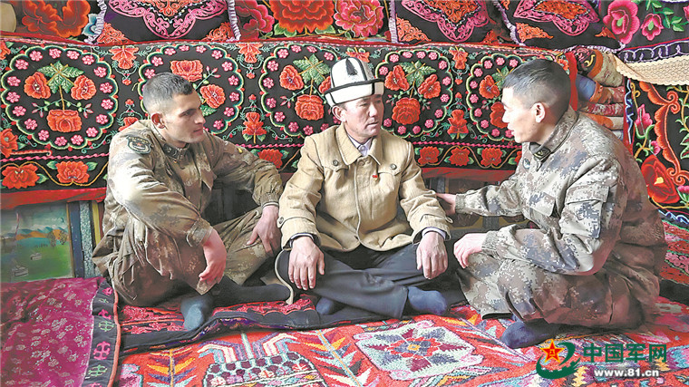 這一天,新疆喀什軍分區(qū)木吉邊防連迎來一位特殊客人,官兵將一位柯爾克孜族牧民團團圍住,熱烈交談。