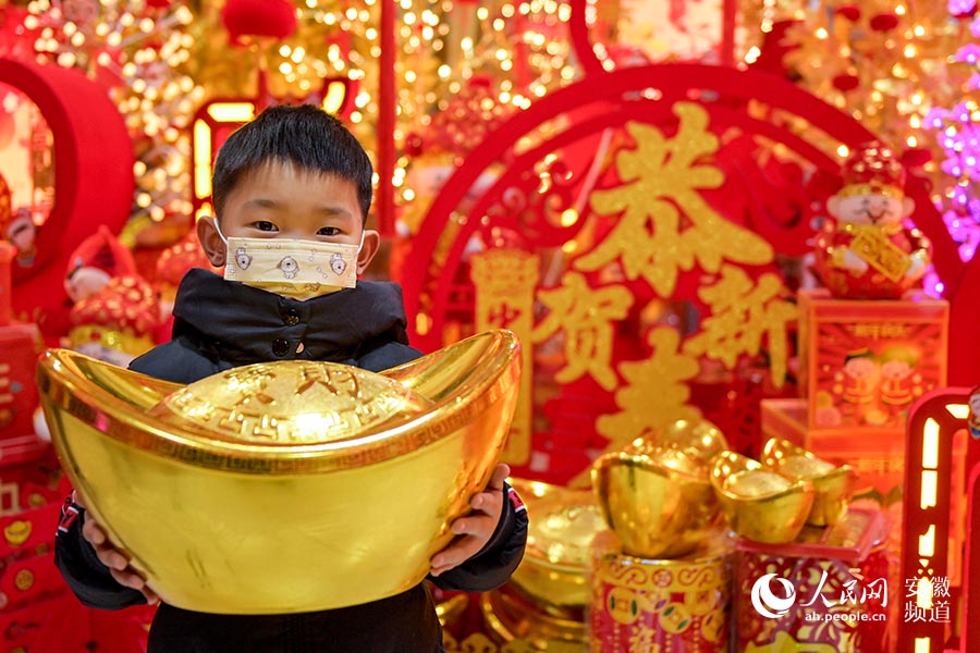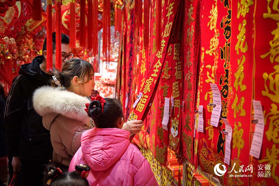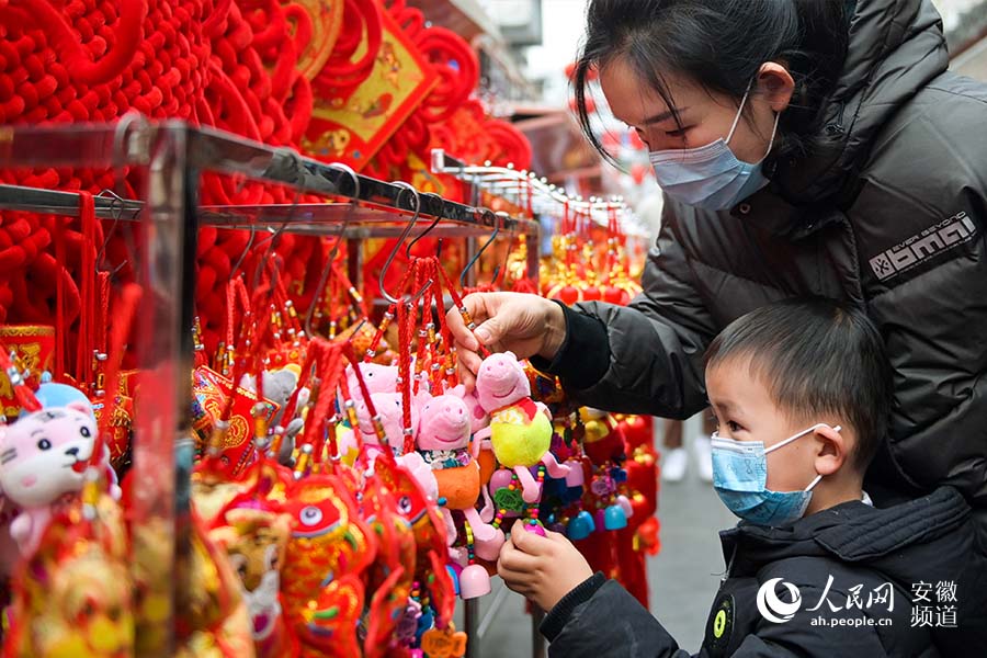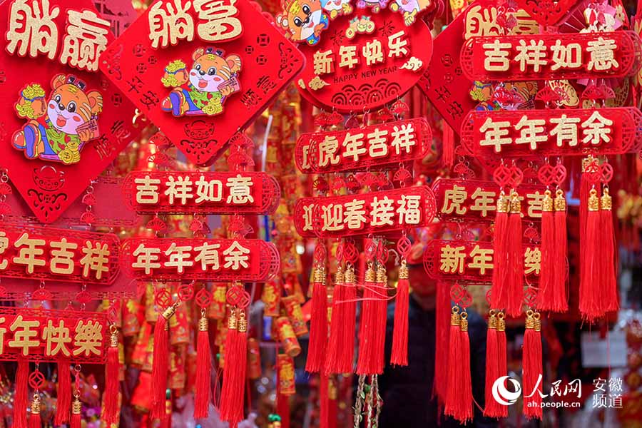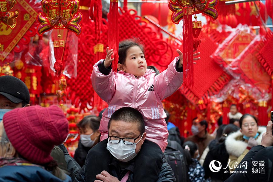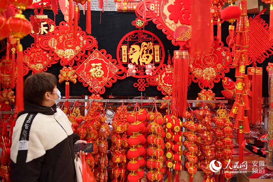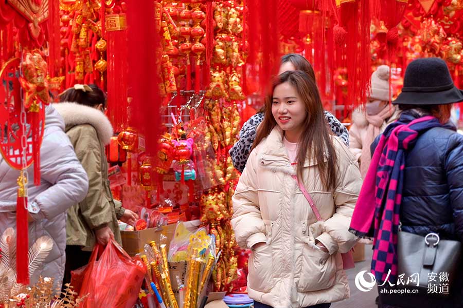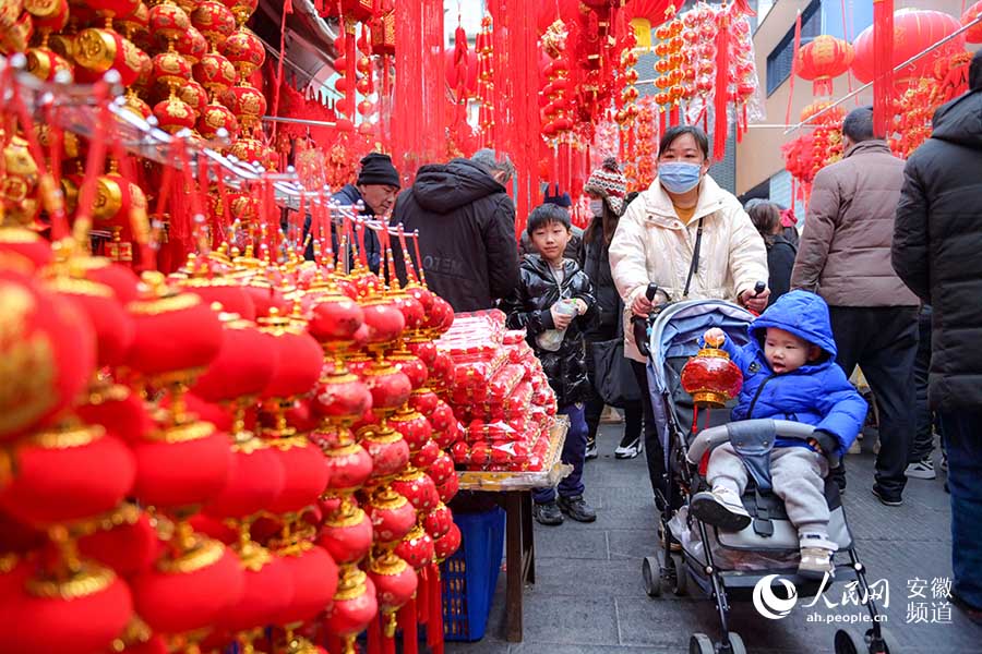 商戶們將中國結(jié)、福字、燈籠、吉祥物等新年飾品高高掛起,映紅了整個(gè)街道。合肥市民三兩結(jié)伴成行,在琳瑯滿目的年貨中挑選著鐘意的款式,大人小孩臉上都洋溢著過年的喜悅。