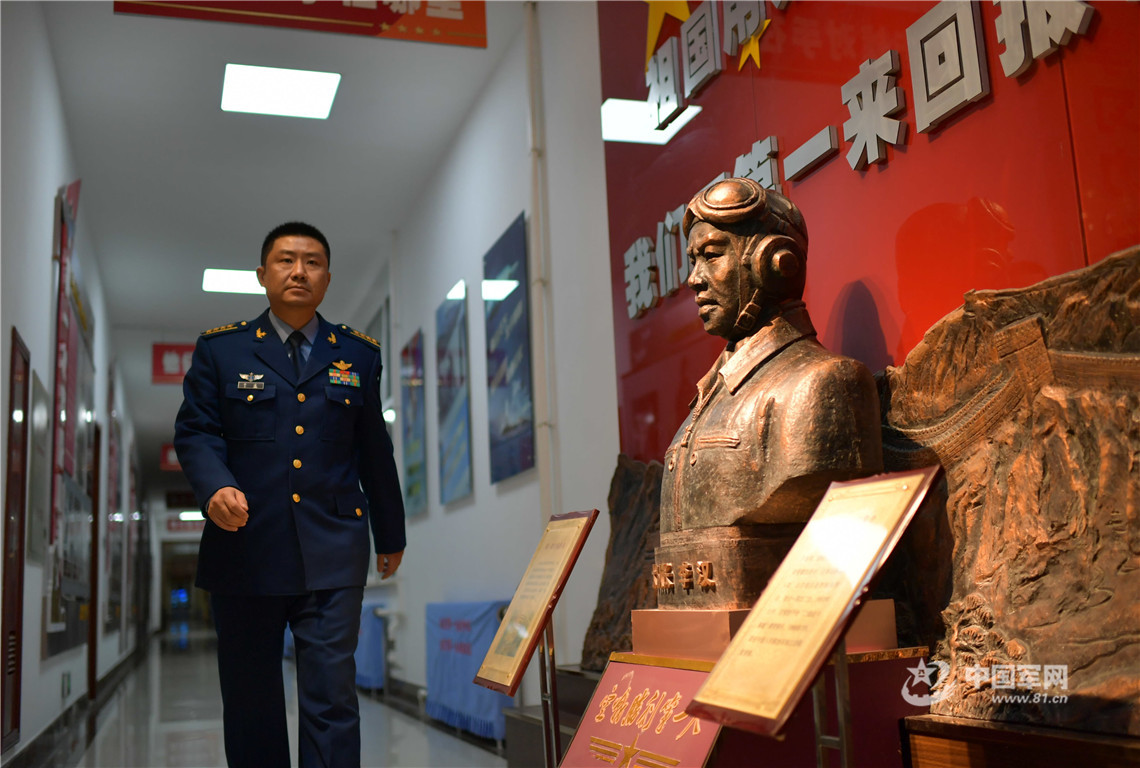 空勤樓內(nèi),李凌從人民空軍空戰(zhàn)擊落敵機(jī)第一人李漢的雕像前走過。余紅春 攝