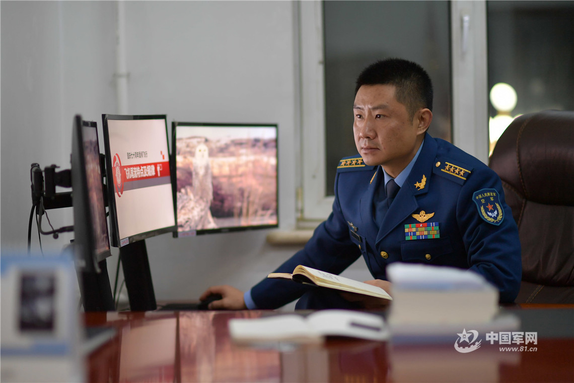 夜晚,李凌在空勤樓內(nèi)認(rèn)真學(xué)習(xí)。近年來,他帶領(lǐng)團(tuán)隊緊盯科技之變、戰(zhàn)爭之變、對手之變,大興學(xué)習(xí)研究之風(fēng),不斷推動部隊學(xué)以致用。余紅春 攝