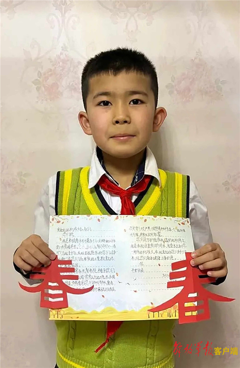 “高原駐訓(xùn)的解放軍叔叔你們好,有許多話想對(duì)你們說。你們不分晝夜保護(hù)著我們的祖國,讓我們過上幸??鞓返纳睢]有你們的守護(hù)就沒有人民的安寧生活,沒有你們的保障,也就沒有國家強(qiáng)大的進(jìn)步與自信。你們?nèi)缍绽锏呐枺炎约旱臏嘏冀o了我們,而你們卻在寒冷的高原與嚴(yán)寒和風(fēng)雪對(duì)抗……”