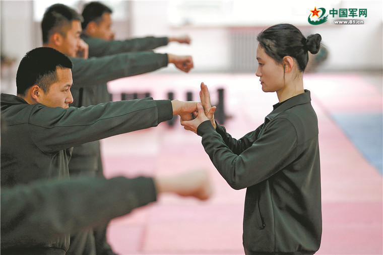 第一次見到葛亞萌,她當搏擊教員已有一年多。訓(xùn)練場上,她給準備參加搏擊比武的學(xué)員講動作要領(lǐng)。為了糾正學(xué)員的錯誤動作,她惟妙惟肖地模仿了幾名學(xué)員的失衡動作和失控表情,引來陣陣笑聲。