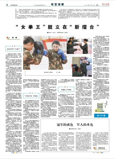葛亞萌身上有一種“敢于面對”的堅韌——像她賽場上的經(jīng)歷一樣,握緊拳頭出拳、再出拳,面對成長路上的挫折與挑戰(zhàn),她總是近乎倔強地堅持。她經(jīng)歷了奮力向上時的艱辛,如今更要耐住歸于平常后的考驗——基層火熱的熔爐冶煉、鍛打著她,讓“女拳王”的名號與軍人打仗的本位不斷靠攏,讓她的拳頭對準新的標靶。其實,葛亞萌面對的是一個新的“擂臺”、一場更有分量的“拳賽”、一段更有跨度的軍旅人生。