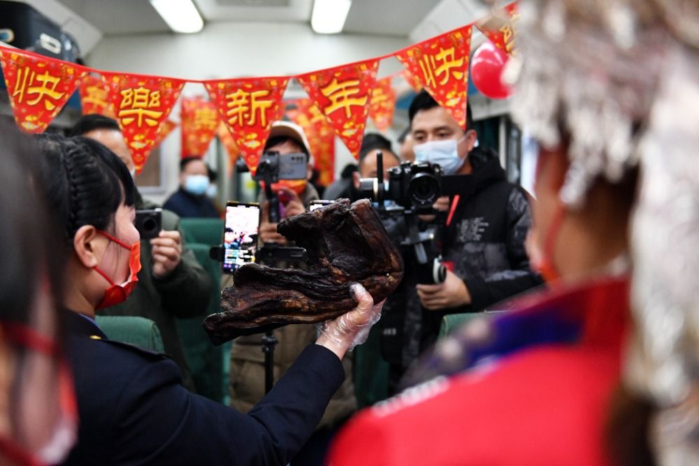 1月26日,列車乘務員直播帶貨當?shù)嘏D肉。 新華社記者 陳振海 攝