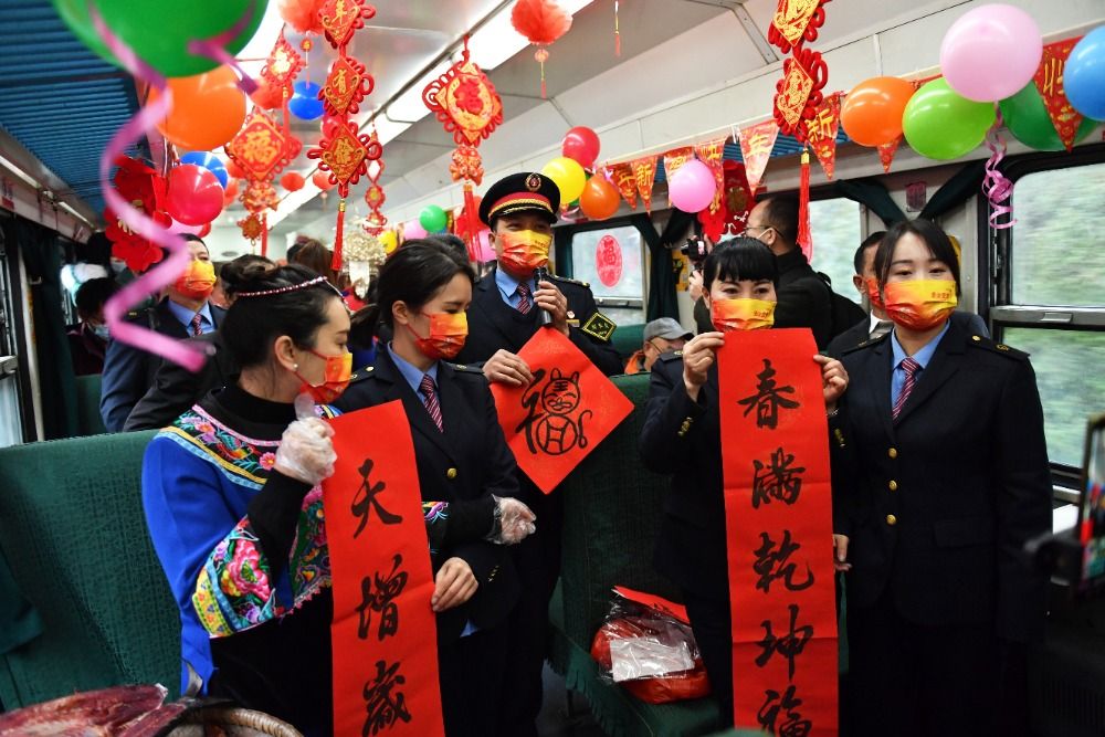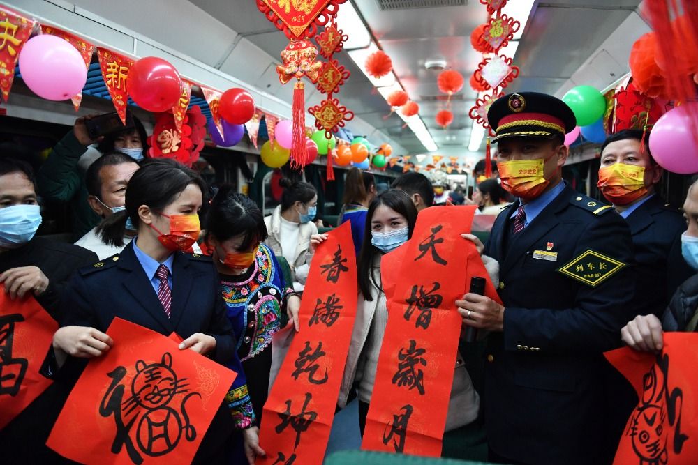 1月26日,列車乘務員向旅客贈送對聯(lián)。 新華社記者 陳振海 攝