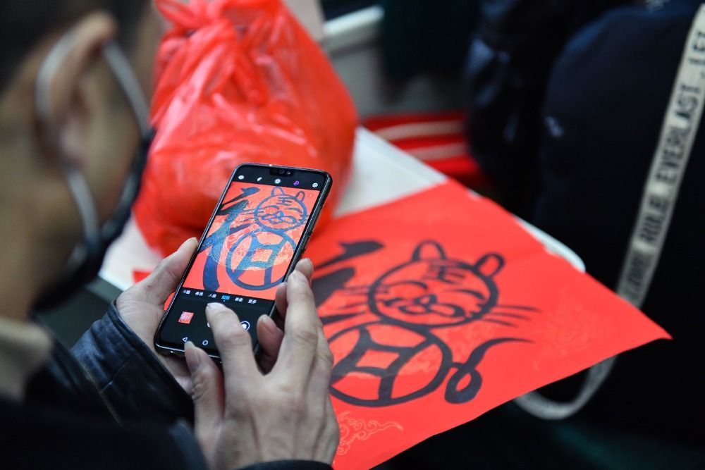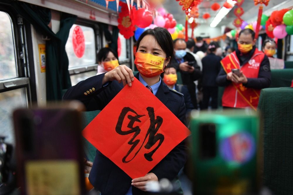 為了讓當天不能在家過小年的旅客感受到列車乘務人員的心意和熱情,休班列車長劉廣還現(xiàn)場手寫福字,送給車上的乘客。