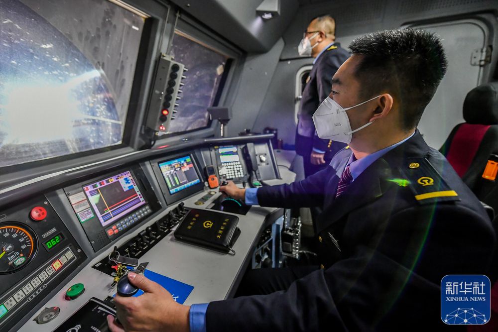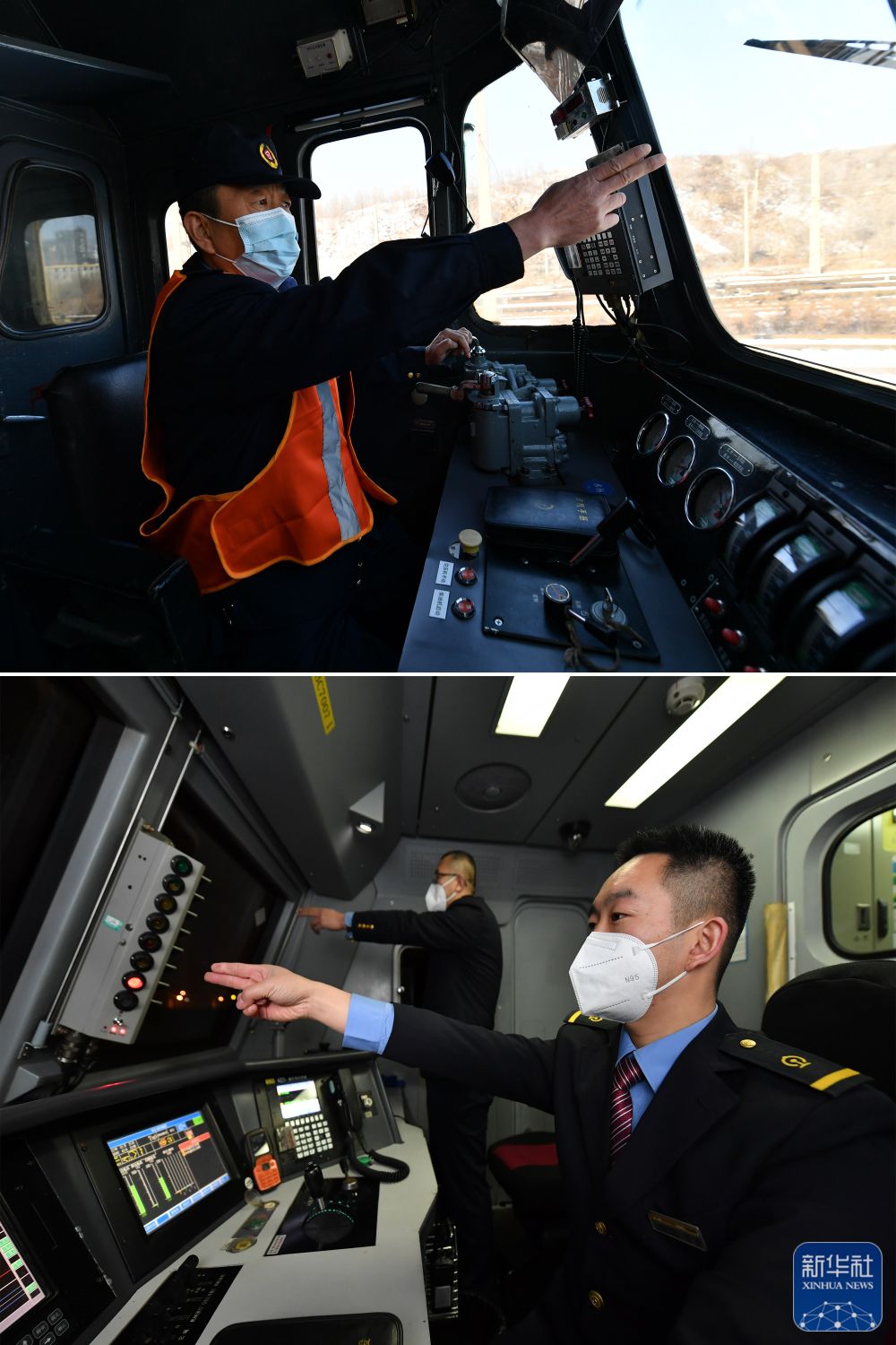↑拼版照片:上圖為李太紅在駕駛列車;下圖為李科(前)在駕駛列車(1月25日攝)。
