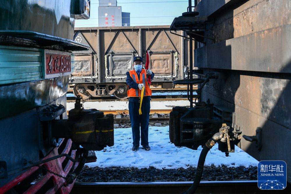 ↑1月25日,李太紅在使用信號(hào)旗指揮列車進(jìn)行連掛作業(yè)。