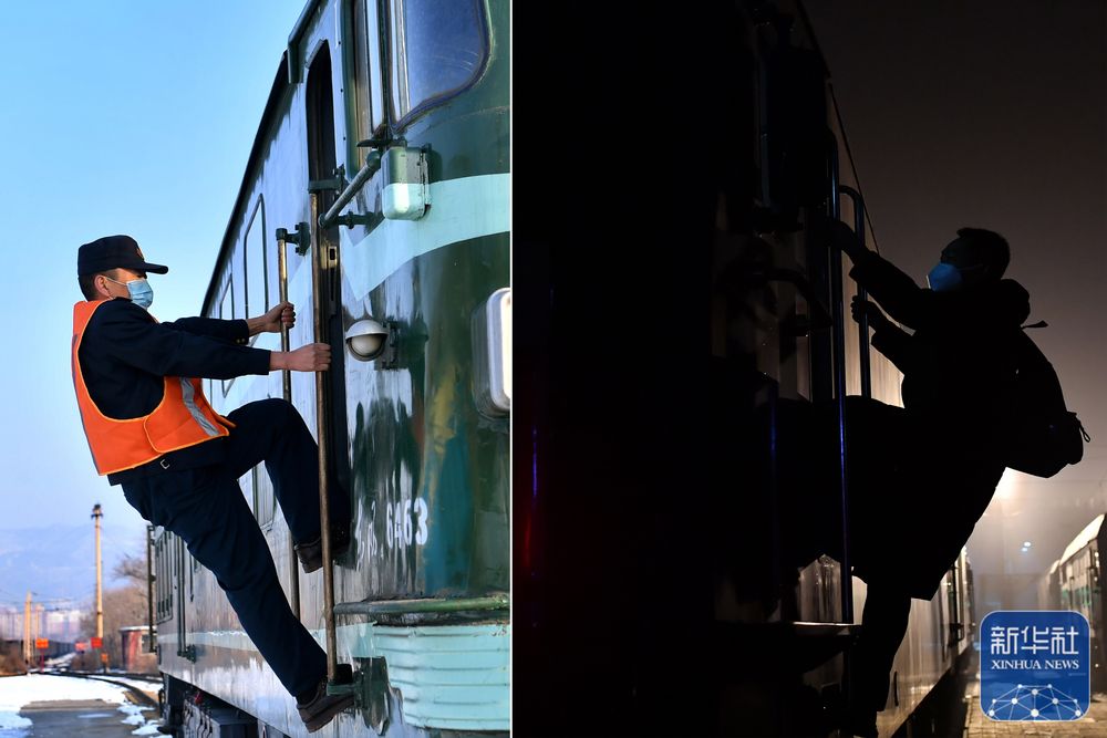 ↑拼版照片:左圖為李科(左)在做發(fā)車前的準(zhǔn)備工作;右圖為李太紅(右)在做發(fā)車前的準(zhǔn)備工作(1月25日攝)。