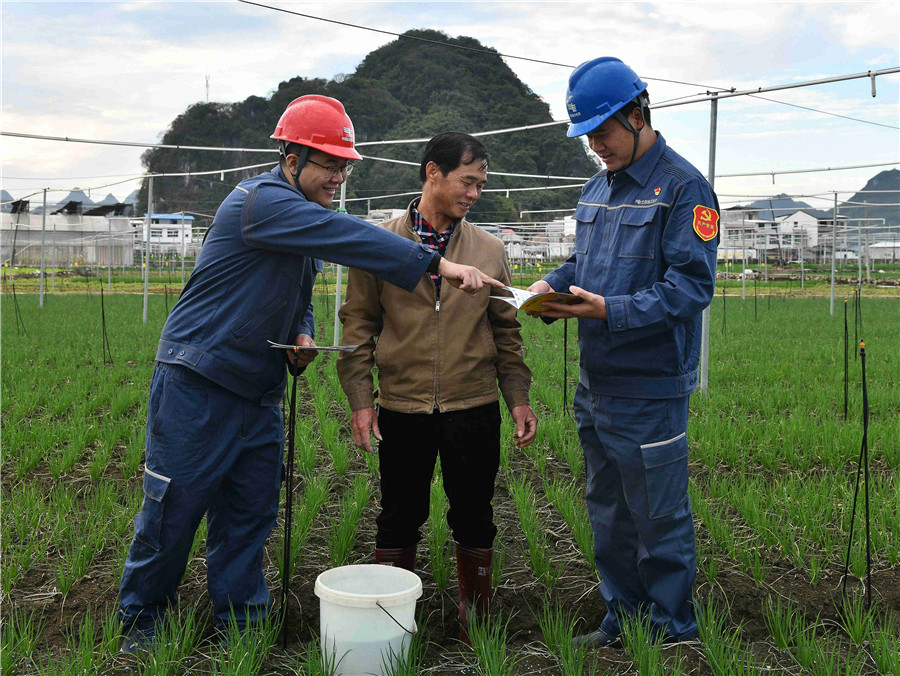 南方電網(wǎng)廣西柳州柳江供電局三都供電所“三妹”黨員服務(wù)隊深入田間地頭,為蔥農(nóng)提供定期上門服務(wù)。張東杰 攝