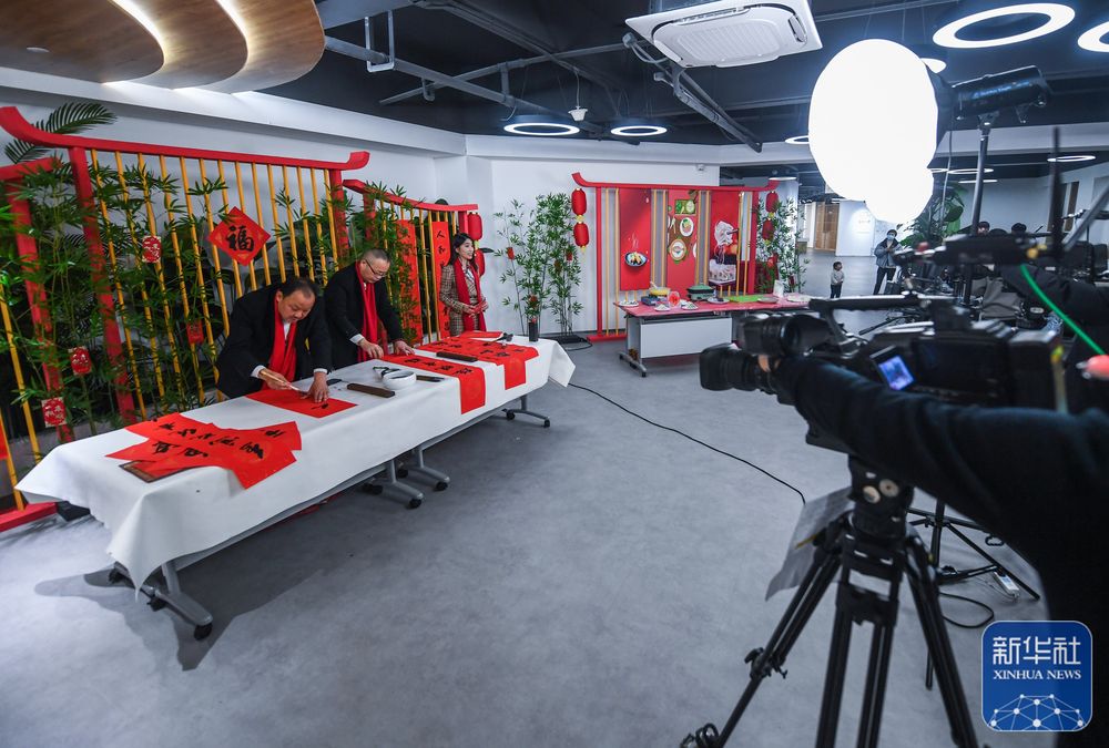 ↑1月26日,參加村晚直播的書(shū)法愛(ài)好者在書(shū)寫(xiě)春聯(lián)。