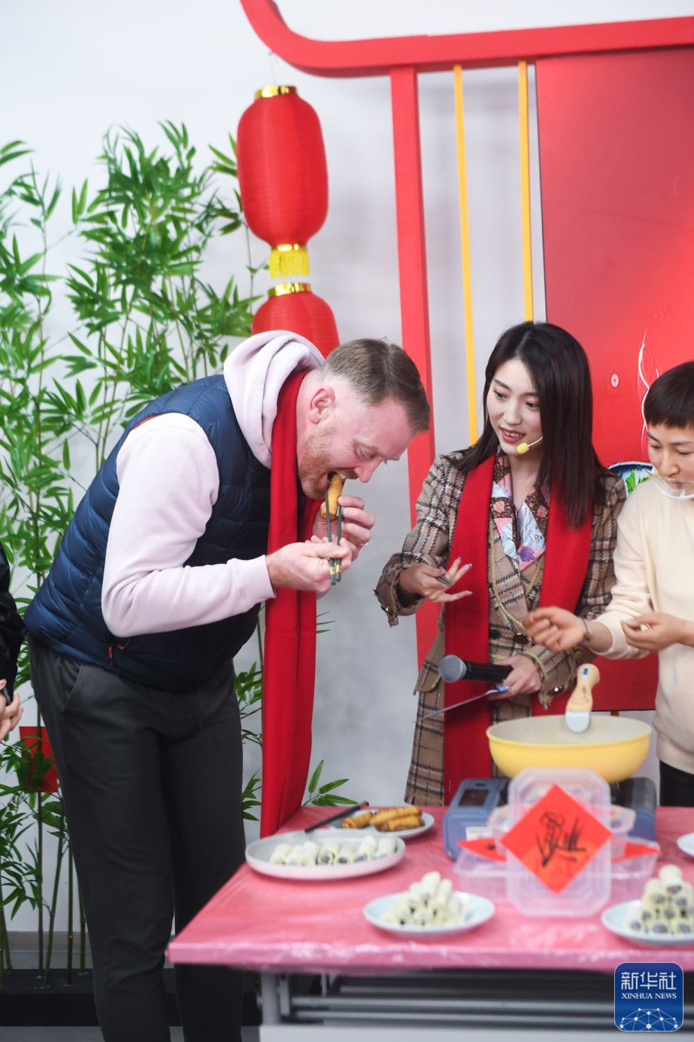 ↑1月26日,外籍居民在“云上村晚”現(xiàn)場(chǎng)品嘗剛剛出鍋的春卷。