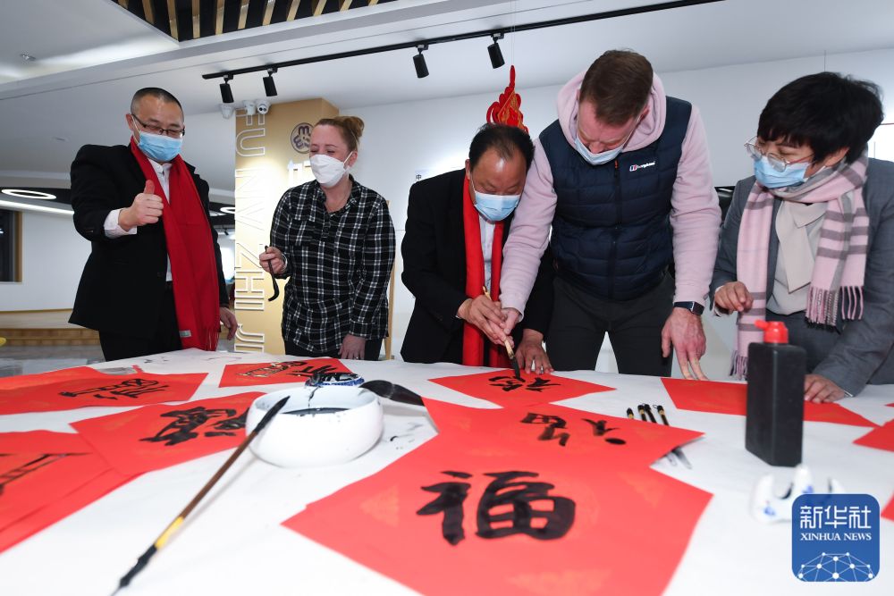 ↑1月26日,在中泰街道工作和生活的外籍居民在“云上村晚”活動(dòng)現(xiàn)場(chǎng)學(xué)習(xí)寫(xiě)福字。