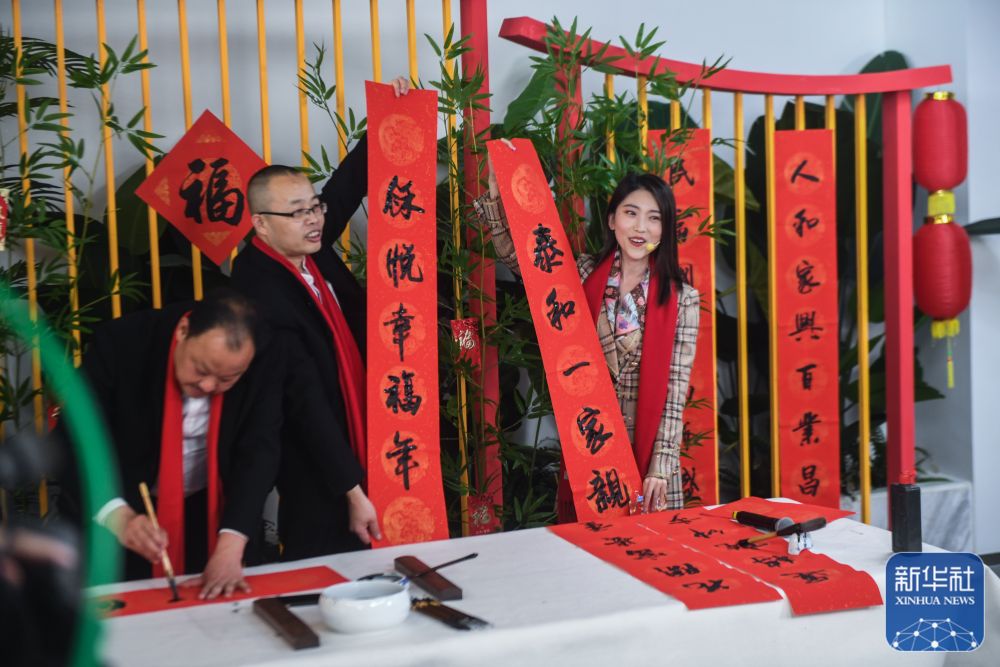 ↑1月26日,參加村晚直播的書(shū)法愛(ài)好者和主持人一起展示寫(xiě)好的春聯(lián)。