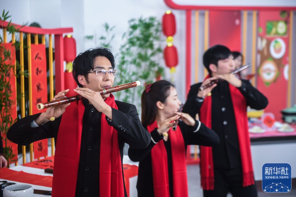 ↑1月26日,參加村晚直播的居民在吹奏竹笛。