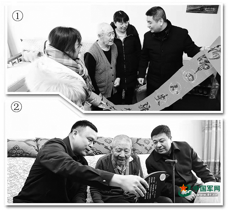 ①慰問小組給老兵韓井全贈(zèng)送春聯(lián)。