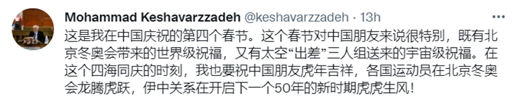 同一天,伊朗駐華大使克沙瓦爾茲扎德在推特發(fā)文,慶祝中國(guó)春節(jié)、助力北京冬奧??松惩郀柶澰聦懙溃骸斑@是我在中國(guó)慶祝的第四個(gè)春節(jié)。這個(gè)春節(jié)對(duì)中國(guó)朋友來(lái)說(shuō)很特別,既有北京冬奧會(huì)帶來(lái)的世界級(jí)祝福,又有太空“出差”三人組送來(lái)的宇宙級(jí)祝福。在這個(gè)四海同慶的時(shí)刻,我也要祝中國(guó)朋友虎年吉祥,各國(guó)運(yùn)動(dòng)員在北京冬奧會(huì)龍騰虎躍,伊中關(guān)系在開啟下一個(gè)50年的新時(shí)期虎虎生風(fēng)!”(海外網(wǎng) 姚凱紅)