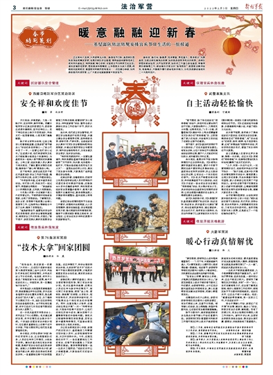 丑去寅來(lái)千里錦,牛奔虎嘯九州春。新春佳節(jié)之際,基層部隊(duì)落實(shí)各項(xiàng)法規(guī)制度要求,在做好部隊(duì)安全管理、確保戰(zhàn)備執(zhí)勤等任務(wù)正規(guī)有序的基礎(chǔ)上,科學(xué)統(tǒng)籌、精心安排,豐富官兵節(jié)日物質(zhì)文化生活;遵守疫情防控要求,落實(shí)探親休假制度,讓休假官兵與親人團(tuán)聚;根據(jù)相關(guān)政策規(guī)定,看望慰問(wèn)和救濟(jì)困難官兵……這些暖心舉措,如同拂面春風(fēng)吹進(jìn)軍營(yíng),讓廣大官兵在融融暖意中歡度佳節(jié)。