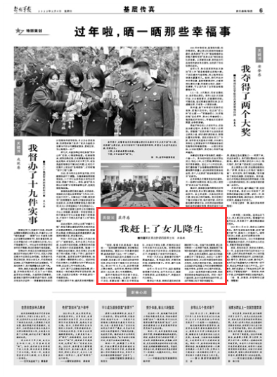 2021年11月30日,我的女兒順利降生。我打電話給連長報喜,說到“謝謝大家”時,眼角又一次濕潤了。領(lǐng)導們的關(guān)心關(guān)愛、戰(zhàn)友們的幫助支持……一幕幕情景歷歷在目。2021年我最幸福的事就是這次經(jīng)歷,不僅迎來女兒的出生,更感受到組織的溫暖。