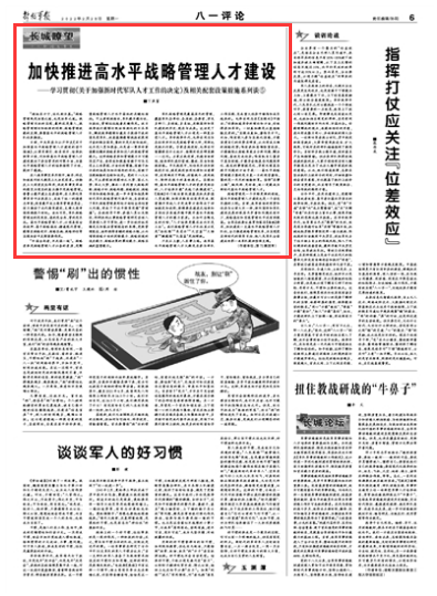 日前,中央軍委辦公廳印發(fā)《關(guān)于加強(qiáng)高水平戰(zhàn)略管理人才建設(shè)的若干措施》,從需求牽引、體系設(shè)計、培養(yǎng)機(jī)制等方面,對加強(qiáng)高水平戰(zhàn)略管理人才建設(shè)提出了務(wù)實管用的對策辦法,為高水平戰(zhàn)略管理人才的培養(yǎng)指明了方向,提供了遵循。
