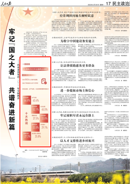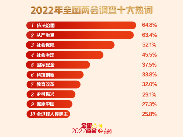 民之所盼,政之所向。2022年1月30日至2月25日,人民網(wǎng)開展第21次全國兩會調(diào)查,超過562萬人次參與。網(wǎng)友投票結(jié)果顯示,“依法治國”“從嚴(yán)治黨”“社會保障”三大熱詞關(guān)注度位居前三位,位列熱度第四位至第十位的熱詞分別是“社會治理”“國家安全”“科技創(chuàng)新”“教育改革”“鄉(xiāng)村振興”“健康中國”“全過程人民民主”。