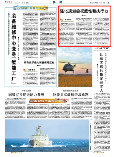 軍隊(duì)建設(shè)“十四五”規(guī)劃是國防和軍隊(duì)現(xiàn)代化新“三步走”的起步規(guī)劃,是實(shí)現(xiàn)建軍百年奮斗目標(biāo)的藍(lán)圖設(shè)計(jì)。落實(shí)規(guī)劃是一項(xiàng)宏大工程,涉及國防和軍隊(duì)建設(shè)各個(gè)方面,不但系統(tǒng)性強(qiáng)、涉及因素多、牽扯面廣,而且任務(wù)體量大、能力標(biāo)準(zhǔn)高、時(shí)限要求緊。無論是加快新型力量建設(shè),還是提升武器裝備現(xiàn)代化水平;無論是推進(jìn)現(xiàn)代后勤縱深發(fā)展,還是提高備戰(zhàn)打仗人才供給能力,都需要進(jìn)一步強(qiáng)化規(guī)劃的權(quán)威性和執(zhí)行力,搞好科學(xué)統(tǒng)籌,有力有序推進(jìn)。
