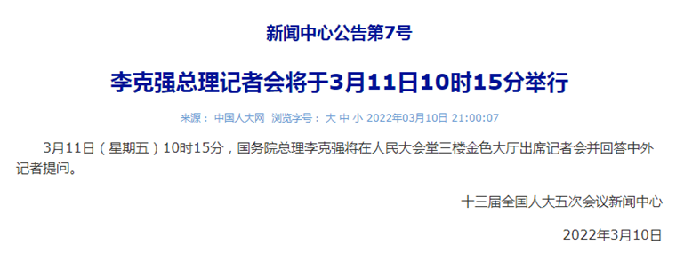 李克強(qiáng)總理記者會(huì)將于3月11日10時(shí)15分舉行