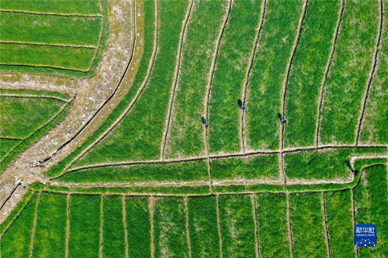 3月9日,浙江省寧波市鄞州區(qū)東吳鎮(zhèn)天童村村民在田間管護農作物(無人機照片)。新華社發(fā)(胡學軍 攝)