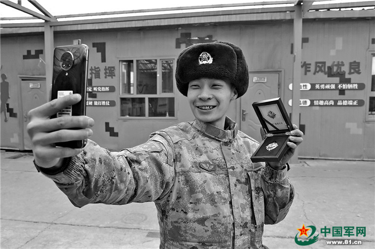 高原陽光房外,新疆軍區(qū)某連一位戰(zhàn)士通過手機視頻向家人展示獲得的榮譽。