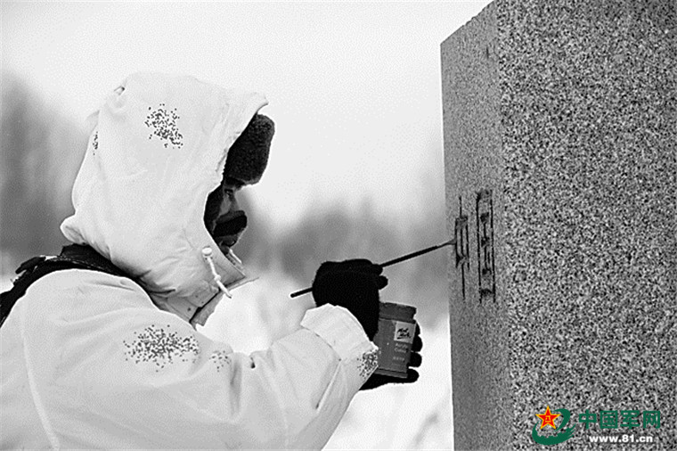 三角山哨所一名戰(zhàn)士描紅界碑。