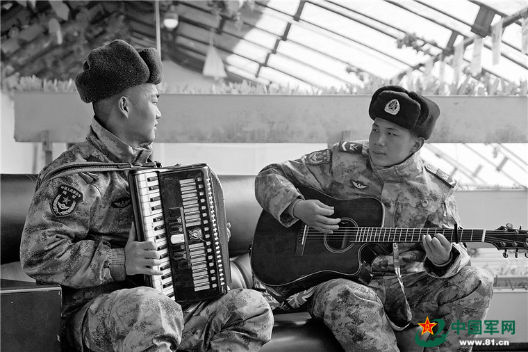 神仙灣哨所官兵組成小樂隊,周末在蔬菜大棚排練。