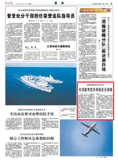 該支隊(duì)近日展開的網(wǎng)絡(luò)安全防范情況問卷調(diào)查結(jié)果顯示,官兵網(wǎng)絡(luò)風(fēng)險防范意識明顯加強(qiáng)。宿松中隊(duì)上等兵黃景盼接受采訪時說:“網(wǎng)絡(luò)是一把‘雙刃劍’,風(fēng)險隱患無處不在,我們必須時刻保持警惕、守好底線。”