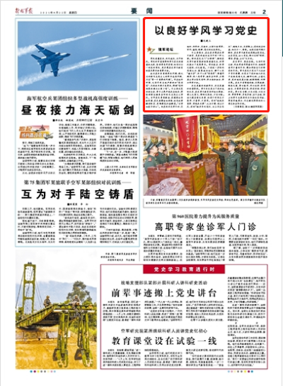 黨史學(xué)習(xí),重在實(shí)踐。毛澤東同志講,吸收那些用得著的東西,拒絕那些用不著的東西,增加那些自己所特有的東西。學(xué)習(xí)黨史不是為了從成功中尋求慰藉,而是為了更好地從歷史中汲取思想之光、精神之鈣、力量之源,更好地武裝頭腦、破解難題、創(chuàng)新發(fā)展。黨史中有智慧經(jīng)驗(yàn)、發(fā)展規(guī)律、制勝之道,學(xué)以致用、用以促學(xué)、學(xué)用相長,方能學(xué)有所思、學(xué)有所悟、學(xué)有所獲。要以史為鏡、以史為鑒、以史為師,常學(xué)常新、多思多悟、實(shí)干實(shí)做,努力把學(xué)習(xí)成果轉(zhuǎn)化為弘揚(yáng)優(yōu)良傳統(tǒng)、強(qiáng)固軍魂意識、矢志精武強(qiáng)能的決心意志和實(shí)際行動。