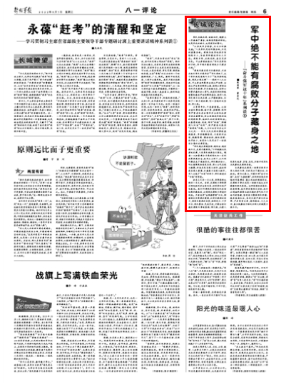 三軍受號令,千里肅雷霆。從堅決查處郭伯雄、徐才厚、房峰輝、張陽等嚴(yán)重違紀(jì)違法案件并全面徹底肅清其流毒影響,到全面推進思想領(lǐng)域的挖根除弊、組織隊伍的清理純潔;從高懸紀(jì)檢、巡視、審計“利劍”,持續(xù)深入糾治“四風(fēng)”,到嚴(yán)肅查處基層“微腐敗”問題,大力糾治官兵身邊不正之風(fēng)……軍隊正風(fēng)反腐的鼙鼓激越高昂、步伐鏗鏘堅定、力度前所未有,鐵腕懲腐、摧枯拉朽,挺紀(jì)在前、抓早抓小,向黨和人民交出了一份很有分量的反腐答卷。