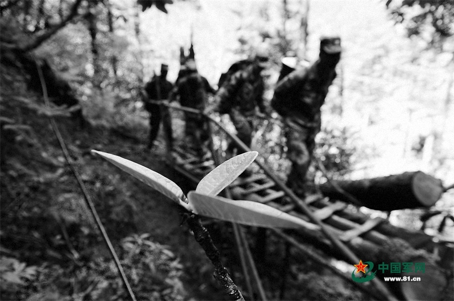 官兵在山路上背運(yùn)物資。