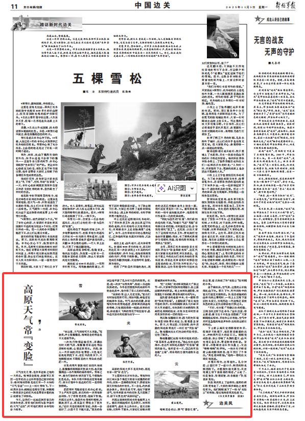 “高原的雪,讓人又愛(ài)又恨?!惫俦鴤冇袝r(shí)惱它阻斷行程、增加風(fēng)險(xiǎn),卻也愛(ài)它的純凈和圣潔。呵氣成冰的清晨,踩著嘎吱作響的雪地巡邏,看朝暉灑滿連綿的雪峰,天地間美得像一幅畫(huà);極寒的夜晚,伴著漫天飛舞的雪花于哨位值守,品味邊關(guān)獨(dú)有的壯麗與安寧……