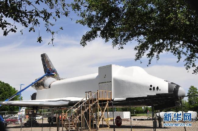 5月1日,將與波音747NASA905組裝的獨(dú)立號航天飛機(jī)模型安放在休斯頓太空中心