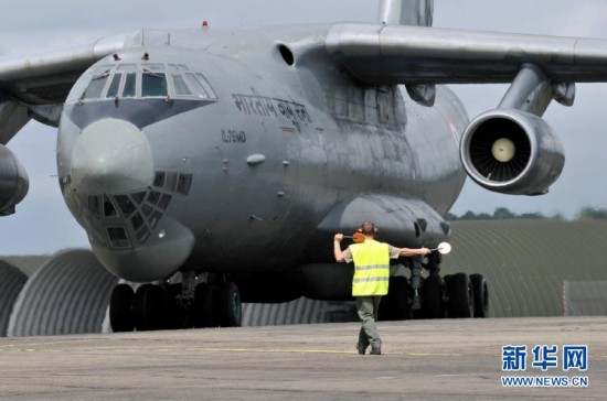 2008年7月15日,在法國(guó)蒙德馬??哲娀?,前往美國(guó)參加“紅旗2008”軍演的印度空軍伊爾-76軍用運(yùn)輸機(jī)在引導(dǎo)人員指示下進(jìn)入停機(jī)坪。伊爾-76運(yùn)輸機(jī)由蘇聯(lián)伊留申設(shè)計(jì)局研制,其載重量可達(dá)40噸,除俄羅斯空軍裝備外,還向英國(guó)、印度、波蘭、伊朗、中國(guó)等國(guó)出口,并以其為平臺(tái)發(fā)展出預(yù)警機(jī)、空中加油機(jī)等型號(hào)。新華社/法新