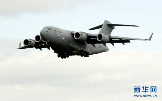 2012年3月20日,英國(guó)皇家空軍一架C-17軍用運(yùn)輸機(jī)準(zhǔn)備在卡特頓降落。C-17軍用運(yùn)輸機(jī)載重量具有高度靈活性,既可以完成遠(yuǎn)程戰(zhàn)略投送,也能勝任戰(zhàn)術(shù)運(yùn)輸和空投任務(wù)。C-17最大載重近78噸,空中加油后最大航程達(dá)11600公里。新華社/法新